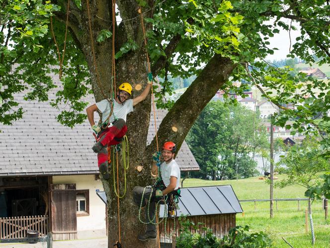 Ein kleiner Einblick in die Arbeit der Firma Baumwelt im Sommer. Zu sehen sind Schneidarbeiten im Laub.